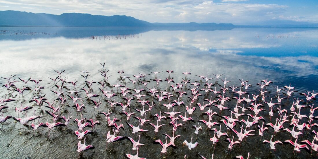 Watching a colorful flock of flamingos covering the soda ash lake Manyara at the depth of the great African rift valley nevertheless a glance of ancient baobab trees and the home of large and massive elephants in Tarangire